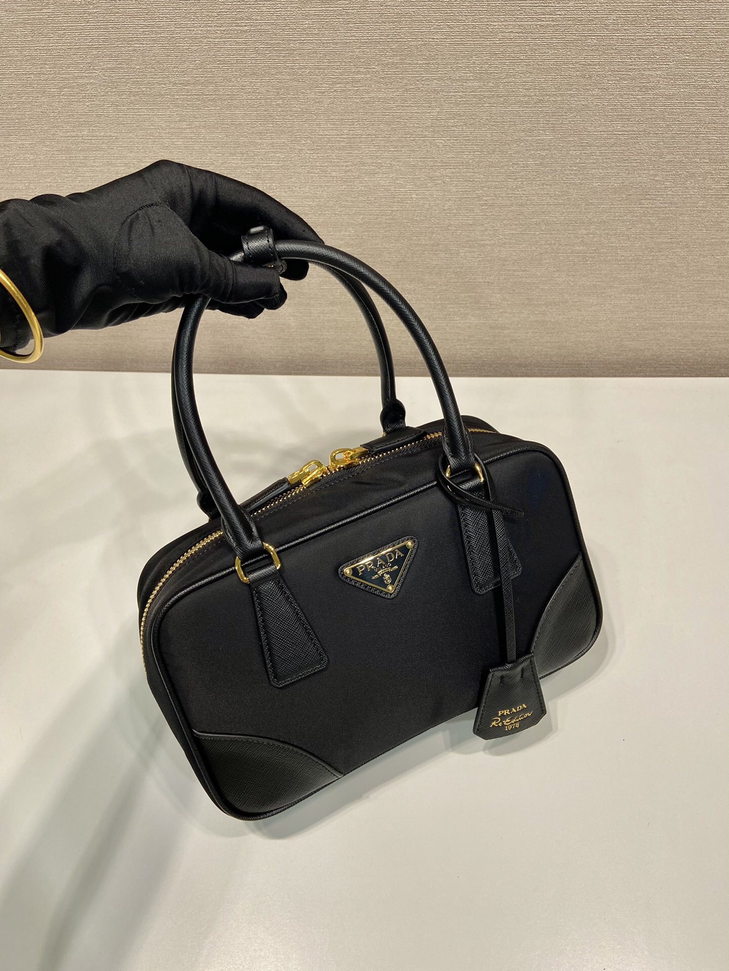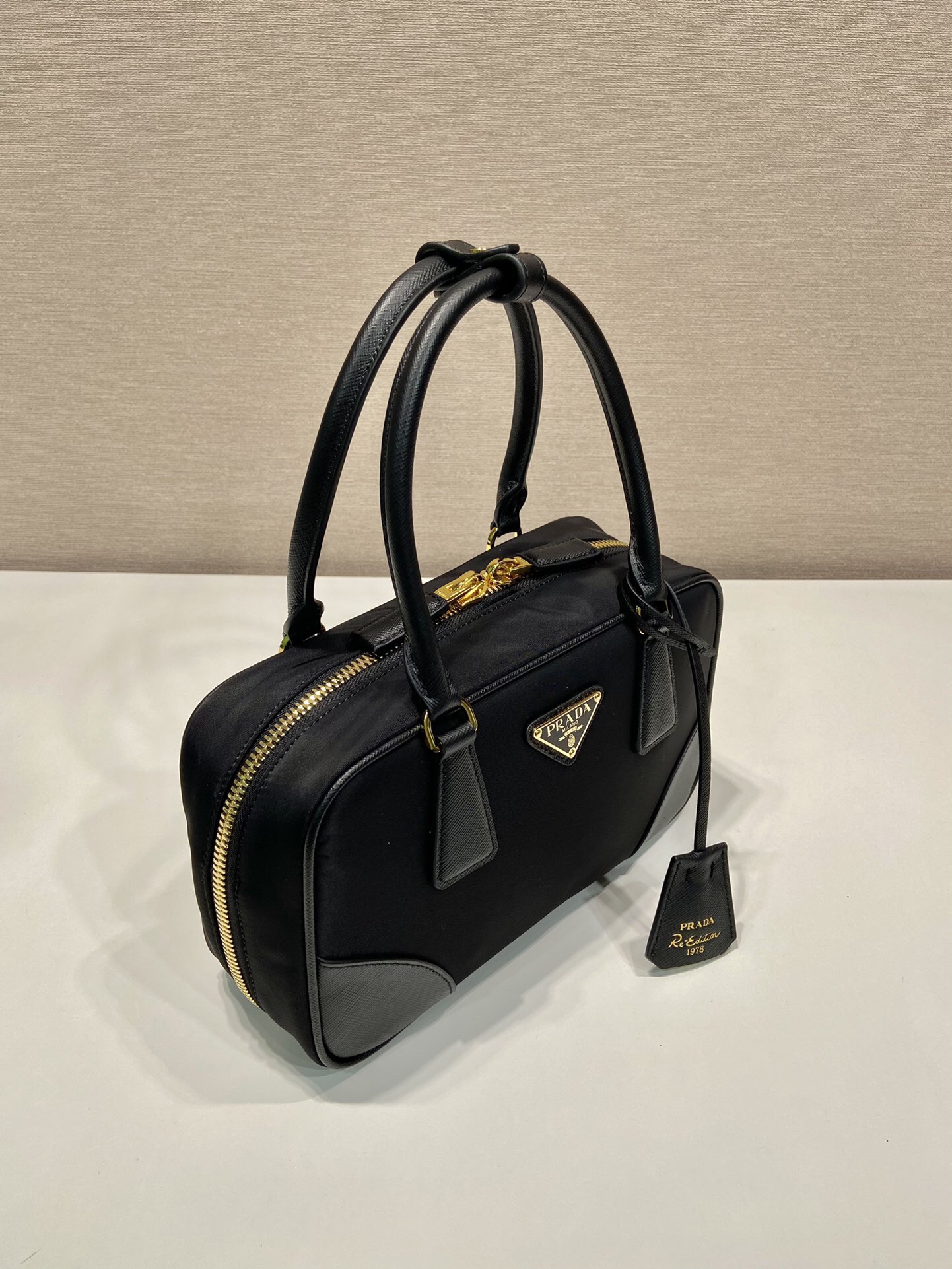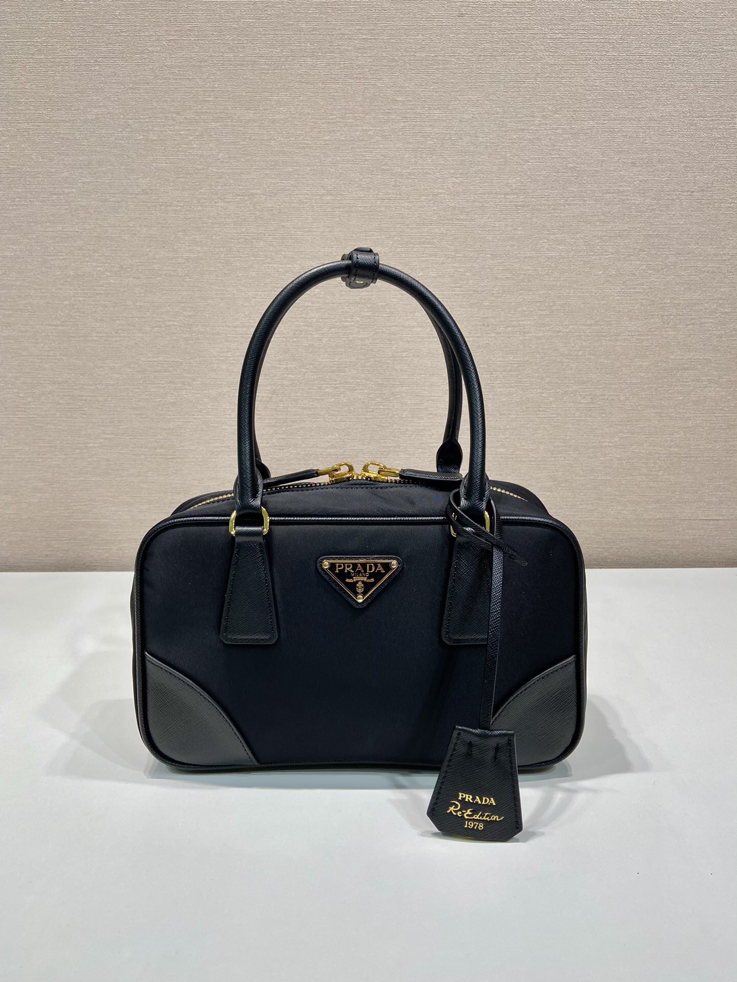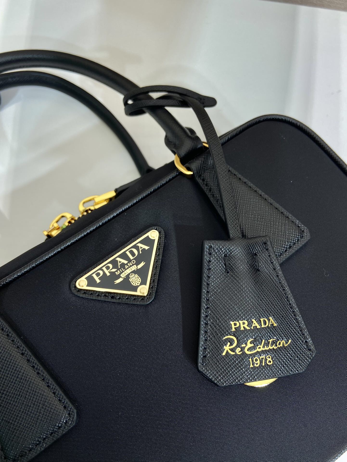PRADA Re-Edition 1978 Enamel Triangular Metal logo zipper open Shoulder Bag Handbag for Women, black