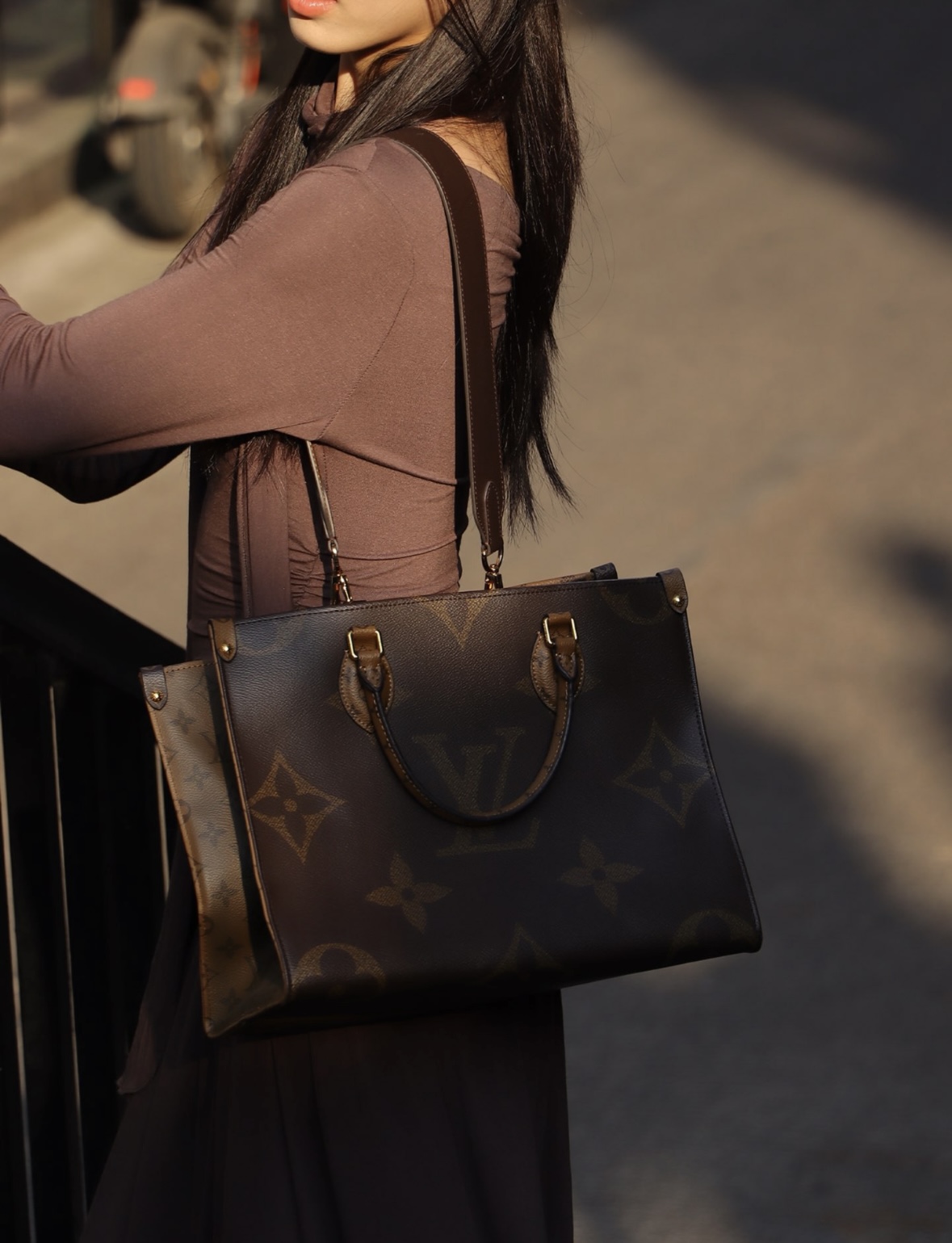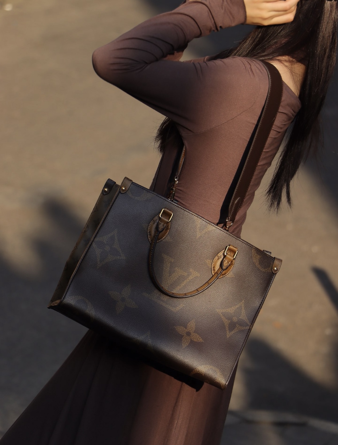 LOUIS VUITTON ONTHEGO classic commuter jungle bag, Tote bag, Tote bag, shopping bag, single-shoulder handbag, medium size, brown/caramel color combination