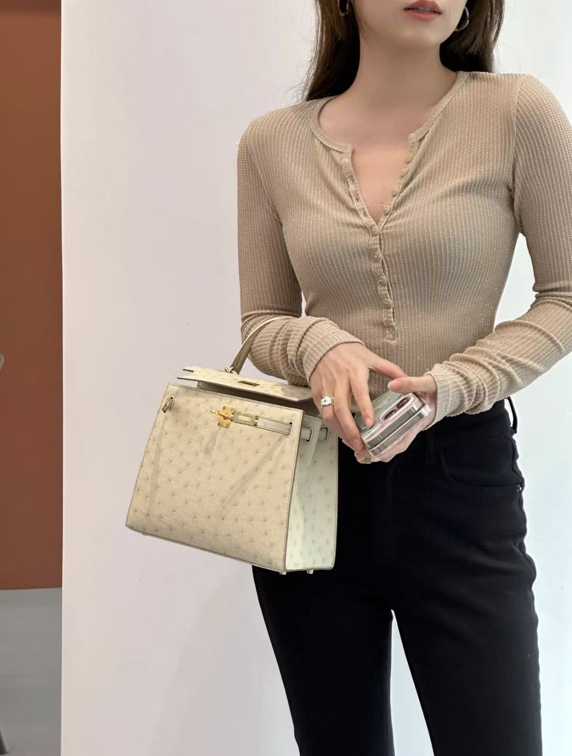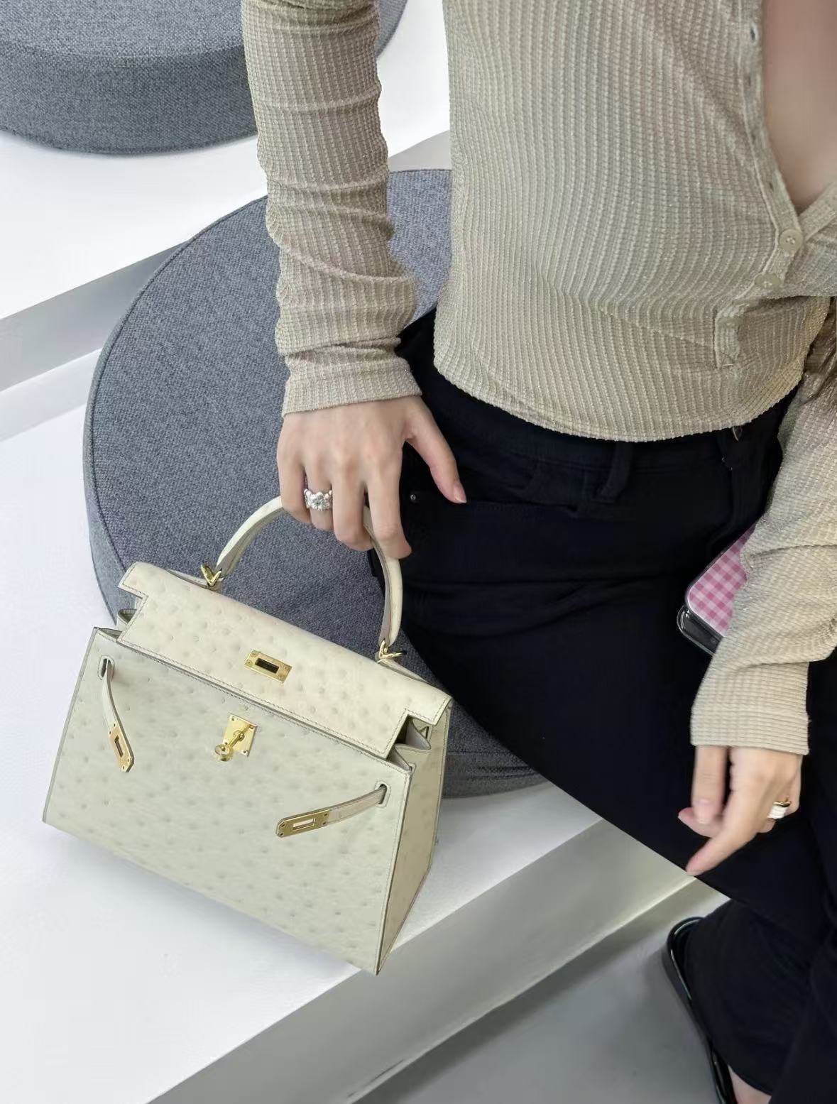 HERMES爱马仕 Kelly 25 金扣 凯莉包单肩手提包 25 女款 8L Beton 冰川白