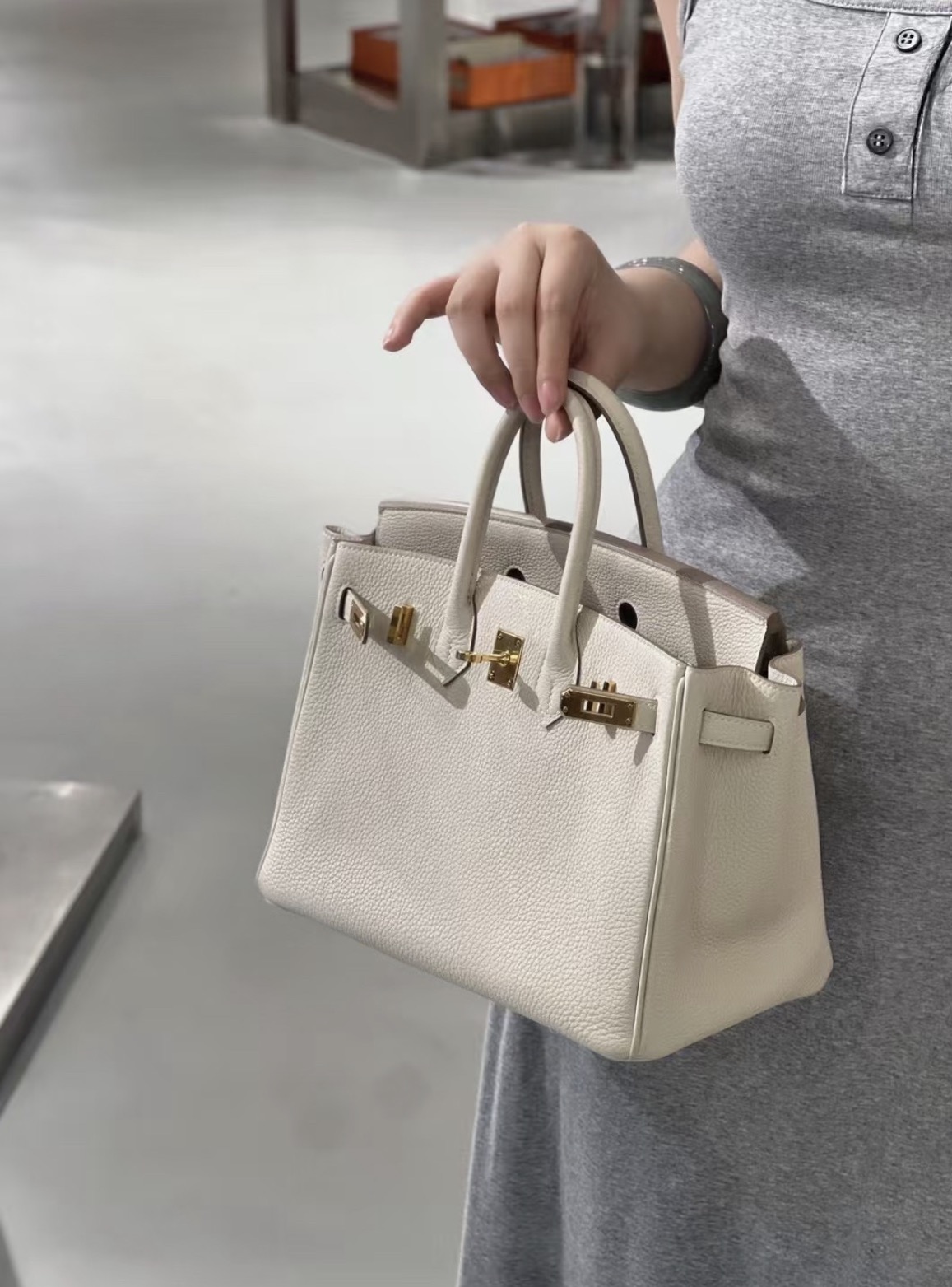 HERMES爱马仕 Birkin 25 金扣 铂金包手提包 女款 8L Beton 冰川白